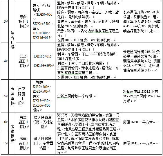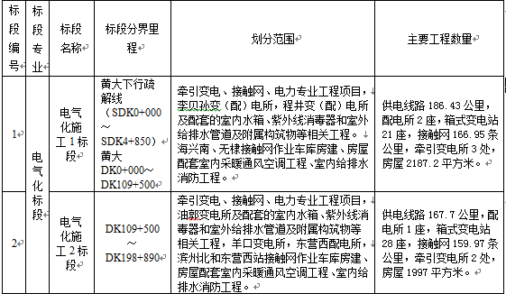 招标范围:新建黄骅南至大家洼铁路站后工程施工,主要包括电力及电力牵引供电,通信、信号及信息,房屋,声屏障等。